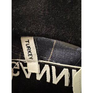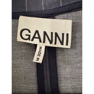 This navy pinstripe midi dress by Ganni features a flattering ruched waist and puff sleeves. Designed with a collared V-neckline, it offers a sophisticated yet modern look, ideal for both professional and social settings. The lightweight material ensures comfort and style throughout the day.