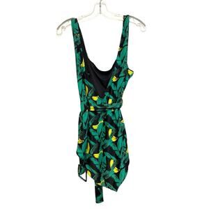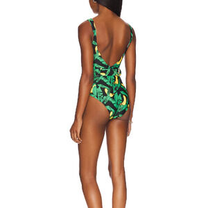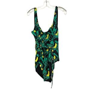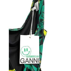 New with tags Ganni Recycled Belted One-piece swimsuit in Banana Tree Black. Classic, retro inspired 1 piece swimwear with removable belt with silvertone buckle in leaf shape. Belt loops. Wide strap tank style top, unpadded. Open back, cheeky bottom. Made of recycled materials in bold banana leaf and fruit all over print. In new condition, hygiene liner. MSRP $235.