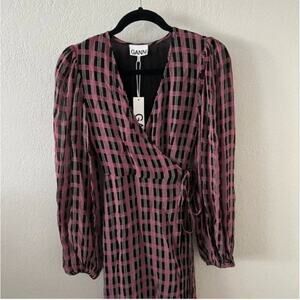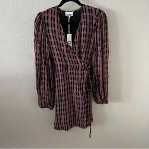 Ganni Plaid Printed Long Sleeve Georgette Mini Wrap Dress