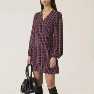 NWT. Pink and black plaid print georgette fabric. Balloon sleeves. Wrap style dress.