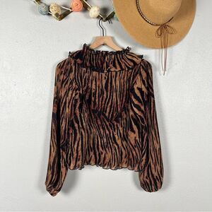 Riffing off the liberated '60s, this georgette-plisse blouse has ruffled trims to highlight the oversized collar. The balloon sleeves add to the style's fluidity, while the print of dark tiger stripes add an undeniably retro feel.