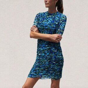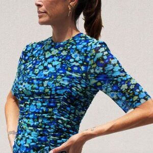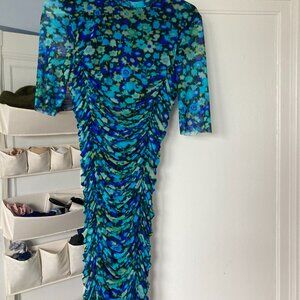 Bought this dress for a cocktail attire wedding, ended up going with another piece -- so this is unworn, excellent condition. As gorgeous on as the photos suggest. So versatile, too! Fits true to size, in my opinion (I"m 5'4" and arund 135 pounds) - but the stretchiness is very forgiving, so could fit someone larger or smaller than me.
