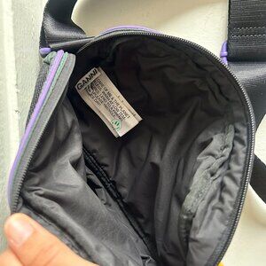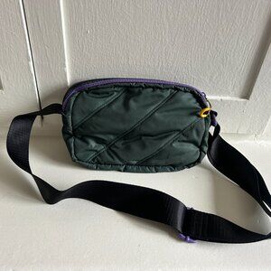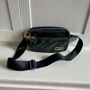 Stylish and surprisingly roomy used Ganni quilted "Festival" crossbody bag made from recycled polyester in forest green with black adjustable strap, and yellow and purple accents. In used condition- no rips or stains.