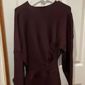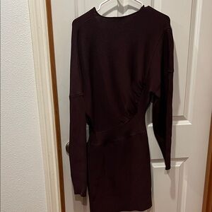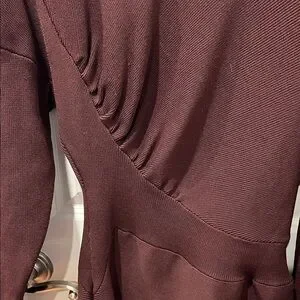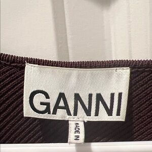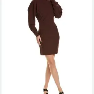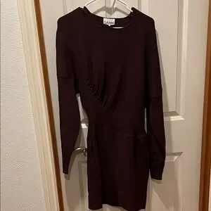 Chic long sleeve dress by Ganni. Features a deep burgundy brown hue. Perfect for elegant outings.