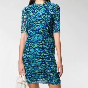 Ganni Ruched Floral Blue Mini Dress Skze 34