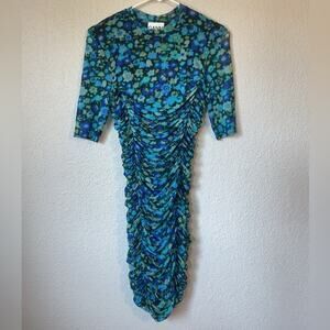 Designer Ganni blue floral ruched mini dress. Excellent pre-owned condition with no noticeable flaws!