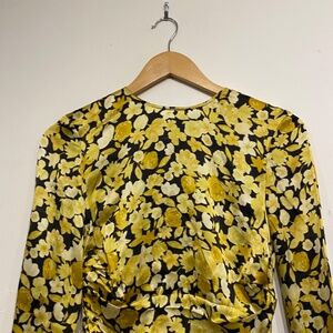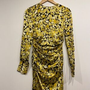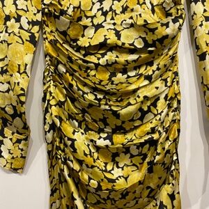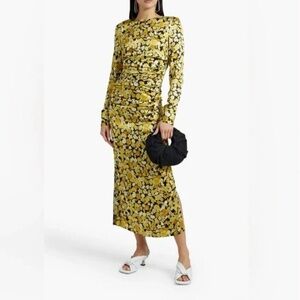 Ganni Silk Stretch Satin Yellow Flora Long Sleeve Maxi Dress Size 34 or US 2