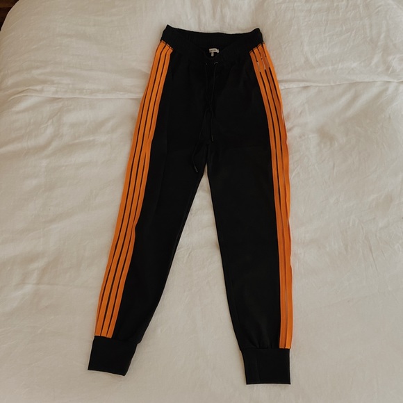 Ganni black activewear jersey track pants with sheer mesh panels between orange side stripes. Ribbed cuffs and waistband.