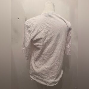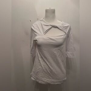 Elegant white blouse with unique cut-out design. Features short sleeves and a stylish knot detail.