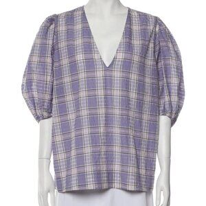 Ganni lavender and blue puff-sleeve cotton blouse. Short-sleeved plaid pattern.