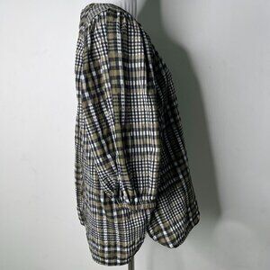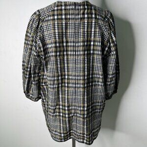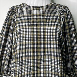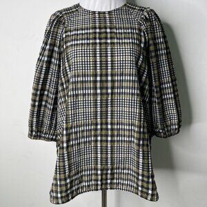 Ganni Women's Tan Black Checkered Puff Sleeve 3/4 Blouse Size 14 US