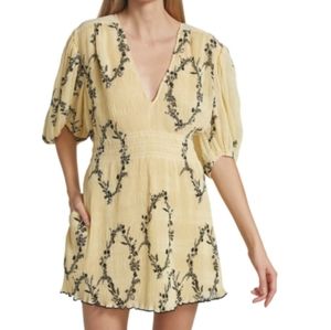 Chic mini dress with floral pattern. Features puff sleeves and a deep V-neckline. Perfect for a stylish look. Wore to a wedding and felt so cute!! Just haven’t had another place to wear this piece