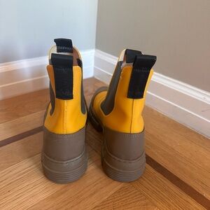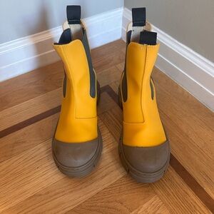 Ganni rubber rain boots. Yellow with brown accents. Worn once.