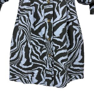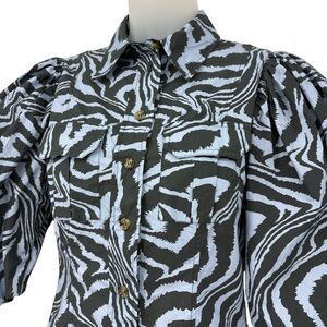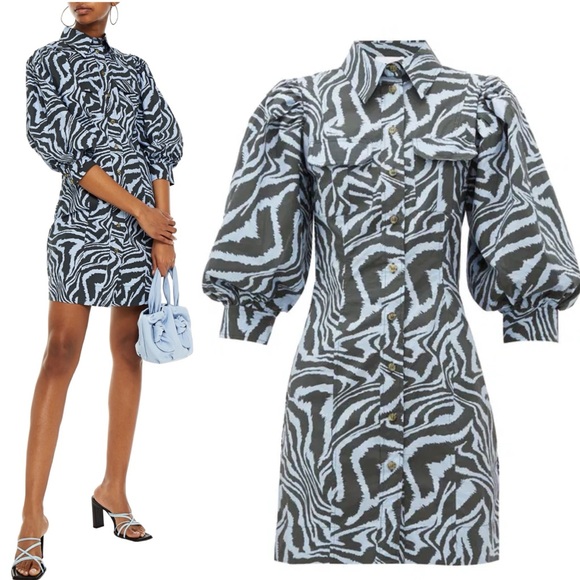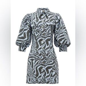 Ganni Zebra Print Cotton Shirt Dress Puff Sleeve Mini Blue Gray Designer EU34 XS
