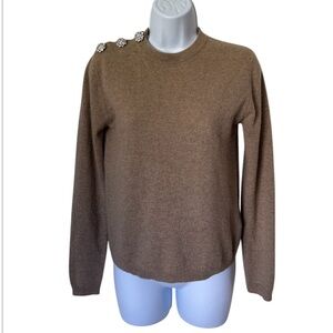 Gianni pullover sweater in camel. Crew neck. Jeweled buttons at shoulder. 100% cashmere. Bust 18” length 23”. Excellent condition. Size. XS