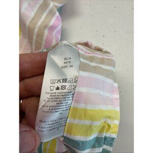The Ganni poplin Square Neck Puff Sleeve Blouse Top in size 34 (US medium) is a stylish and versatile addition to any woman's wardrobe. Made from comfortable cotton material, this pink striped blouse features a flattering square neckline and puff sleeves, making it perfect for various occasions from casual outings to parties. With its bohemian and colorful theme, this designer top is suitable for summer, fall, and spring seasons, adding a touch of preppy charm to your look. Perfect for traveling or adding a pop of color to your business attire, this blouse from Ganni is a must-have for any fashion-forward woman.