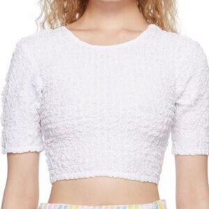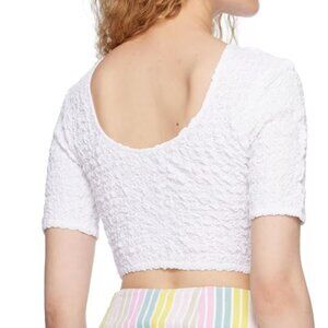 White smocked organic cotton with scoop back and short sleeves. Elasticized cuff and hem.
