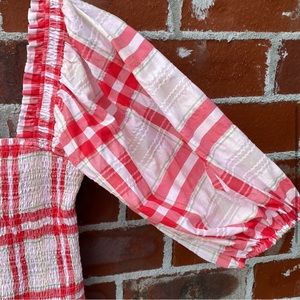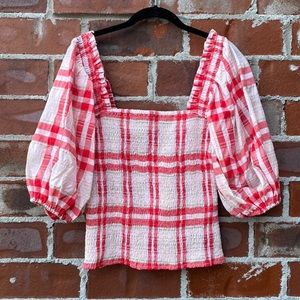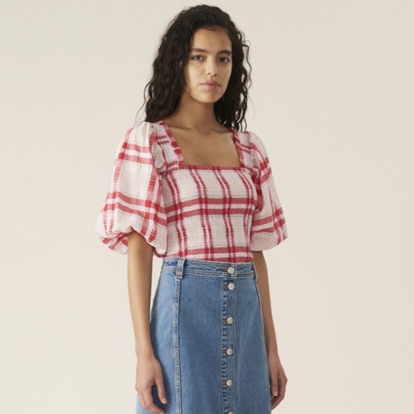 Cut from airy seersucker, this GANNI top makes a charming statement with cherry-red checks and sweet puff-sleeves. Play up the romance with a flowing white maxi skirt, or pair it with distressed denim for weekend ease.