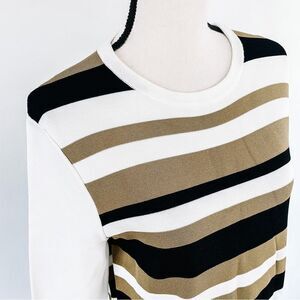 The perfect dress for any occasion in any season. Pair with sandals or strappy heels in the summer months for an elevated casual look, or wear with a leather jacket and knee high boots in the winter. Material is a thick knit featuring color block stripes, metallic gold, crew neck style, 3/4 long sleeves, and knee length fit.