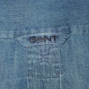 Gant button down light denim look shirt. In good condition. Dry cleaned with starch. Size large. Measurements are approximately collar to bottom hem 34 inches and from arm pit to arm pit 24 inches. Please see photos for a good visual description. Question. Questions welcomed.