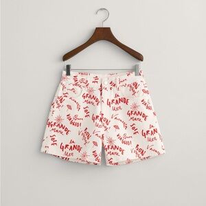 Crafted in comfort stretch cotton, these shorts have been designed in a regular fit with a mid-rise waist, straight leg and mid-thigh length. They feature an all-over text print with hand-written words that evoke a sense of traveling. These shorts are adorned with branded flat donut buttons, front and back pockets, and a leather GANT logo patch at the back waistband.