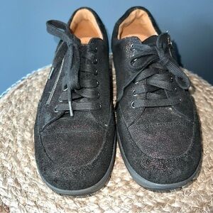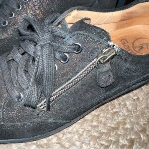 Black Suede Fabric Upper with Subtle Pink Metallic Hues. Zipper allows for easy slip on access. See all the Details in Photo with Size Chart. UK Size 4.5 = US Size 7