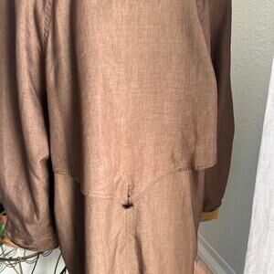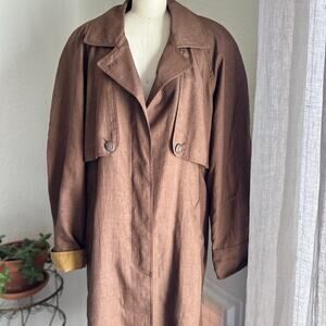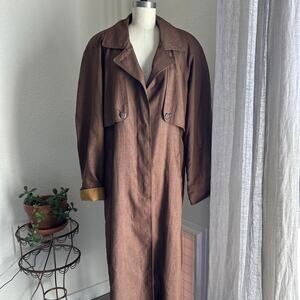 vintage linen coat, brown trench coat, longline overcoat, minimalist outerwear, neutral wardrobe piece, classic vintage style, oversized trench, sustainable fashion, effortless layering piece, timeless linen outerwear