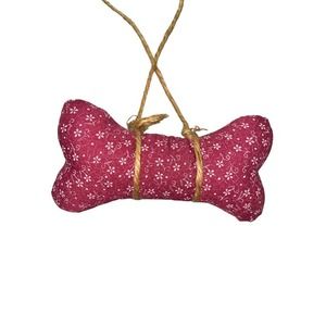 Cream colored dog with original yellow striped shirt, burgundy corduroy overalls and burgundy bone.
