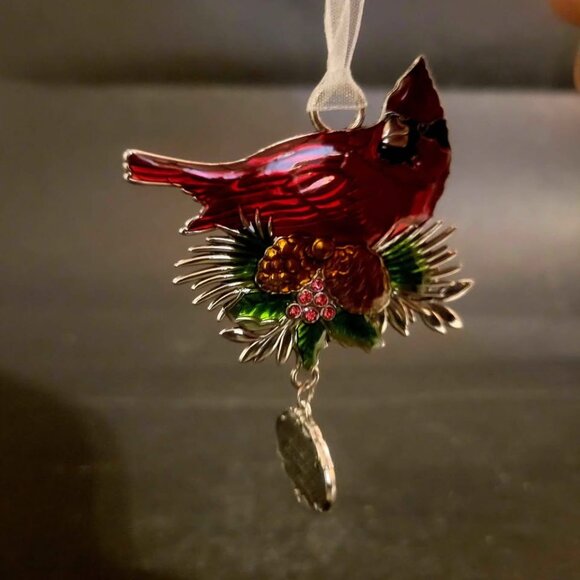 Red Cardinal Bird Christmas Ornament with dangling message charm - "Christmas isn't A Season, I'ts A Feeling" , in zinc/enamel with ribbon, by Ganz. One side of the Ornament is a Red Cardinal and the other is a Silver Cardinal. It's in perfect condition.