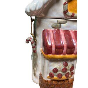 This festive ceramic cookie jar embodies a charming bakery design with intricate hand-painted details. Ideal for holiday-themed decor or functional kitchen storage.