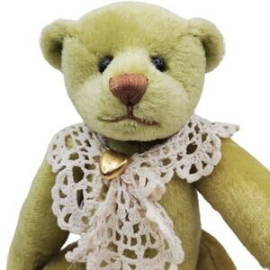 This charming teddy bear from Ganz Cottage Collectibles is an original Lorraine Chien creation made in 1999. The bear measures 11 inches in size and is adorned with a beautiful a crochet collar and a heart locket.