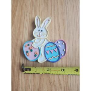 Vintage-style Easter bunny magnet by Ganz. Features a cute white bunny holding three brightly decorated Easter eggs in pastel colors. Perfect for adding a touch of spring cheer to your fridge or magnetic board.