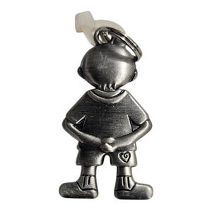 Cute pewter boy charm by Ganz featuring a red enamel shirt with a yellow “F.” Cast pewter with painted accents and a smiling figure design. Measures approx. 1.33" tall. Great for keychains, bracelets, zipper pulls, or personalized gifts. New without tags and unused. Light surface wear from storage only. A fun collectible Ganz piece. See photos.