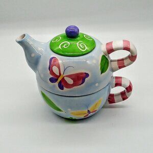 Pretty pastel ceramic stackable tea set for one, adorned with butterflies, swirls and a candy cane design handle, by Ganz.