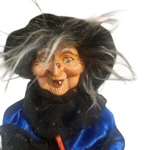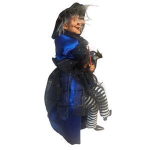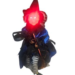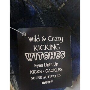 This Ganz witch laughs and kicks her legs while her eyes light up red. She is sound activated and is designed to sit on a shelf. She is battery operated, batteries are included. She is pre owned excellent. The tag is still in tact.
