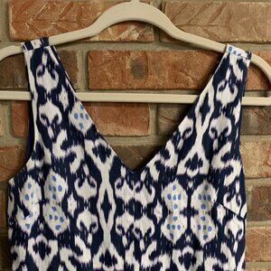 Gap 100% Linen Sleeveless V-neck Fit & Flare Ikat Blue White Mini Dress Size 4