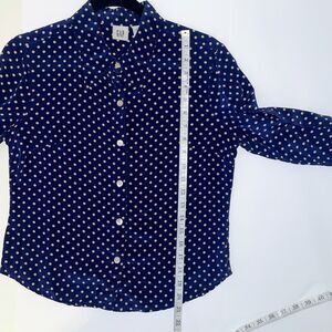 Gap 100% Silk Button Down Top Blouse in navy blue with white polka dot print. This collared silk Button-up shirt is perfect to be dressed up and tucked in or worn open with a tank top for a more casual look. Has a fun and quirky look with the trendy polka dots. Women's size S small, measurements pictured. Excellent used condition.