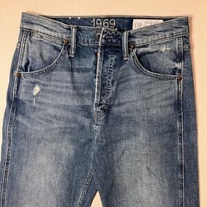 Gap 1969 High Rise Distressed Straight Leg Jeans Medium Indigo Wash Size 8. Features button fly, 4 pocket styling. 98% cotton, 2% spandex/elastane. Style number 528268.