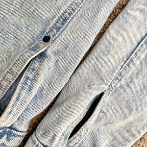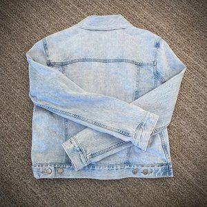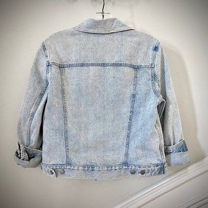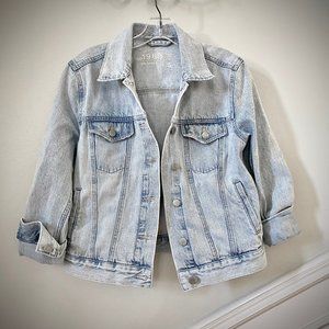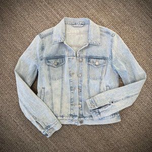 Classic denim jacket by Gap in a perfectly faded light wash. Functional breast pockets. Interior pockets. No holes, stains or tears. Only flaw is a missing rivet on the right sleeve seam as shown. 100% cotton. No stretch. Machine wash. Flat measurements: Bust = 18.5", Length from mid shoulder = 21", Sleeves from shoulder seam = 22".