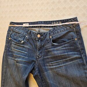 Classic and flattering Gap 1969 bootcut jeans in size 30/10 Long. These jeans feature a medium-dark wash, light whiskering, and stylish flap back pockets with button closures. Soft, stretchy denim gives them a comfortable fit that works great for everyday wear.