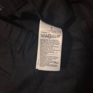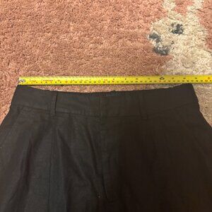 The Gap 365 High Rise Linen Blend Wide-Leg Trousers in Black are versatile dress pants perfect for various occasions such as travel, parties, casual wear, formal events, and business meetings. Made with a comfortable twill fabric blend of linen and cotton, these trousers feature a high rise waist with a pleated front for added style. The wide-leg design and pockets add practicality to the classic fit, making them a timeless wardrobe staple for any preppy fashion-forward woman in size 6. Easy to care for with machine washable instructions, these trousers are a must-have for your closet. 29" Waist. 31" Inseam. 12.5" Rise. 11" Pant Leg Opening. Hem on one pant leg is coming undone, as shown in photo.