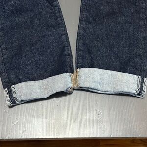 These GAP jeans feature a timeless straight-leg design in a rich blue hue, crafted from durable denim for a classic look. The fabric's substantial weight ensures longevity and a traditional feel, making them a versatile addition to any wardrobe. Cuffed at the ankles. Never worn