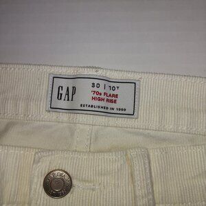 Size 30T Gap 70's Flare Hi Rise Ivory Frost Corduroy Pants. 80% cotton 18^ rayon/viscose 2% spandex. Button and zipper closure. Front and back patch pockets. Waist 16" Rise 12" Inseam 35" Brand new and never worn. Excellent condition.
