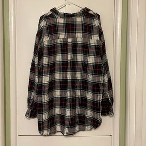 Gap Big Shirt plaid flannel. This is cozy and warm, long sleeved, button down, red, black and white plaid pattern, long hem in back.