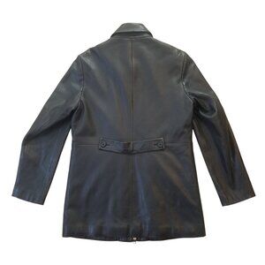 Gap buttery soft, black leather jacket, with a warm wool and quilted lining. It has snaps, and a reversible, two-way zipper for comfortable motorcycle, bicycle, horse back riding, and any other activity that requires wearing a jacket while sitting down.