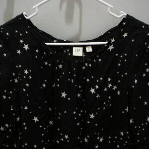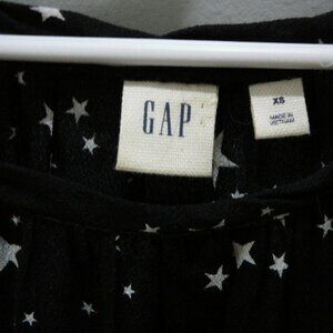 Add a touch of elegance to your wardrobe with this Gap black and white star themed blouse. The blouse features a round neckline and 3/4 bell sleeves with ruffle trim. The easy care and collarless design make it a perfect addition to your casual or formal attire. Made with viscose material, this tunic style blouse is available in XS size for women. The blouse is perfect for any occasion and can be paired with jeans or a skirt.