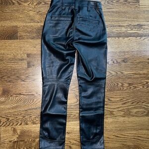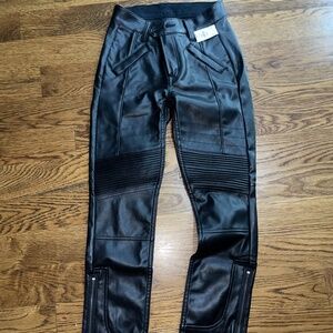 These are a skinny, mid rise fit. The pleather material is super soft and pants have a lot of details including zippers at the ankles! They are a size 00/24 Petite length which are perfect for anyone under 5’3😀