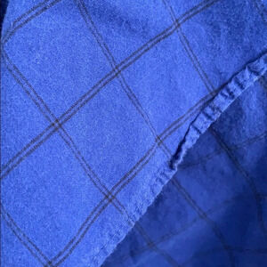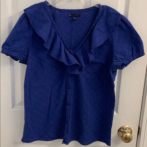 Ruffle neck button down blouse Royal blue with black lines and buttons Good used condition with plenty of life remaining.