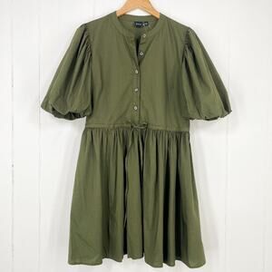 Gap Bubble Sleeve Cotton Poplin Dress Cinch Waist Button Front Size Medium Green