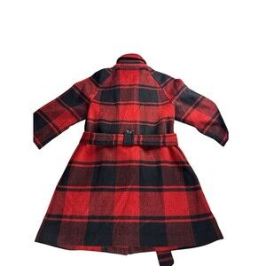 Details: Gap Buffalo plaid trench coat, slant pockets, buttons front with belted waist, mid-length design, 3/4 length sleeves, not lined, dry clean, wool blend.